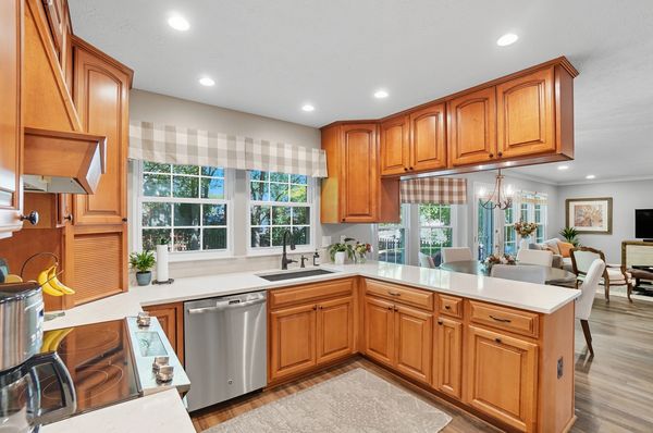 Find crown molding throughout the entire first floor with wide baseboards, new LED lighting, primary suite full bath renovation as well as guest bath renovation.